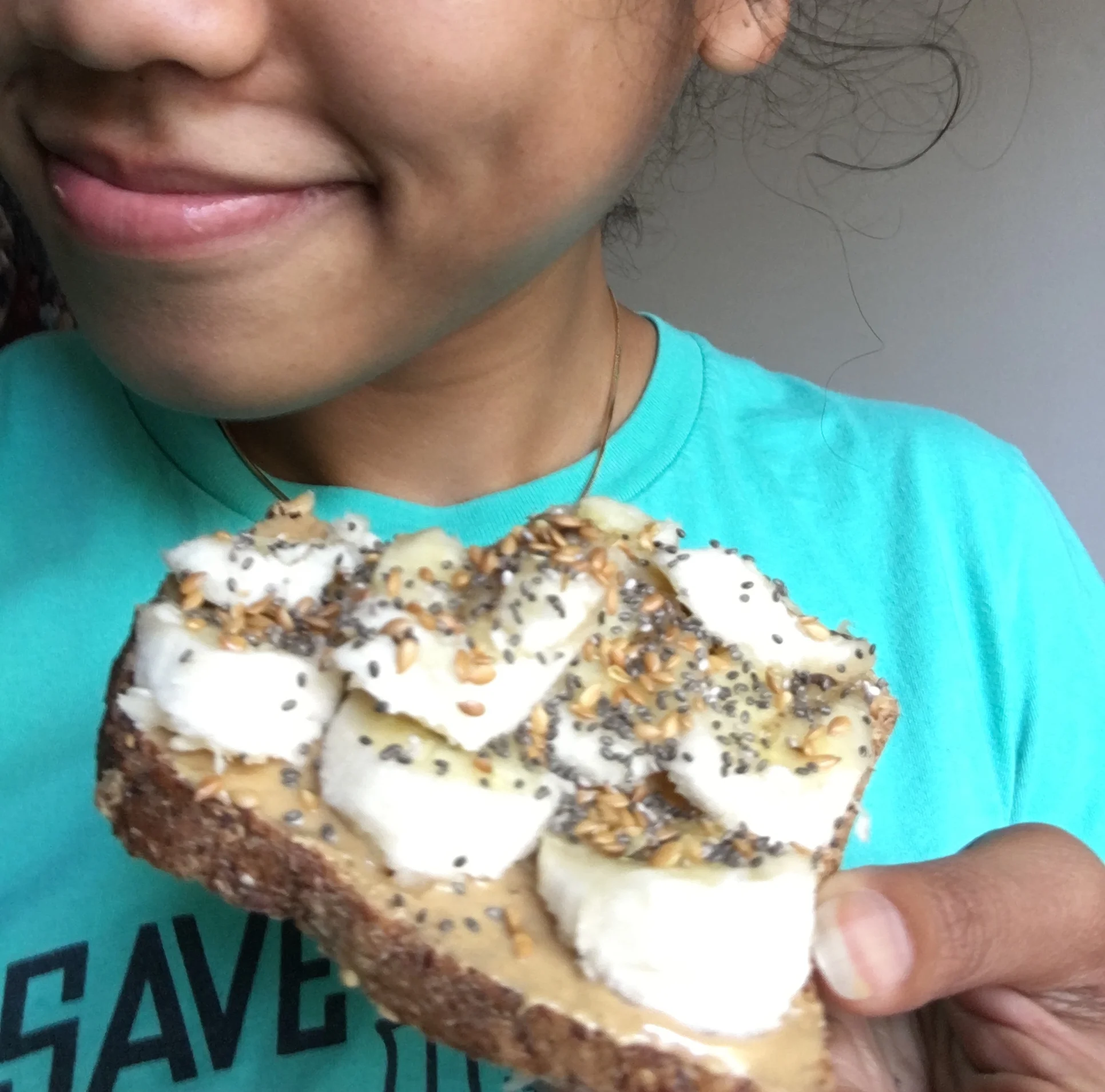 Ezekial Bread with your choice of addictive nut butter (cashew pictured), banana, plus your choice of nutritious seeds (roasted flax seeds and chia seeds pictured). Solid pre- or post- workout. Excuse the crumby lip.