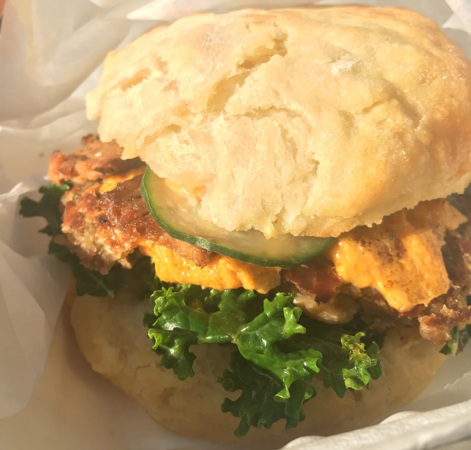 I got the sausage, bacon and cheese with kale and cucumber (all vegan). My first bite of the sandwich washed away all my initial disappointment at Dulce's lack of egg that morning. The biscuit was so comforting- warm, soft and fluffy. The sausage and bacon were flavorful and surprisingly juicy. The cheese was sinfully melty and savory, while the greens gave it a fresh and very subtle crunch.